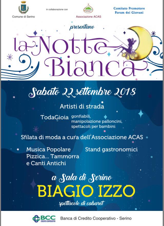 Serino si prepara per una nuova edizione della Notte Bianca organizzata dall’Amministrazione Comunale di Serino insieme ad ACAS e comitato promotore forum dei giovani, che si svolgerà il 22 settembre nel centro della frazione Sala. Molte le novità che si scopriranno nell’edizione di quest’anno che, come gli altri anni, coinvolgerà le attività commerciali di Serino dando sostegno e forza alla loro economia, con una proposta musicale e attrattiva che sorprenderà in positivo le migliaia di persone che la sceglieranno.